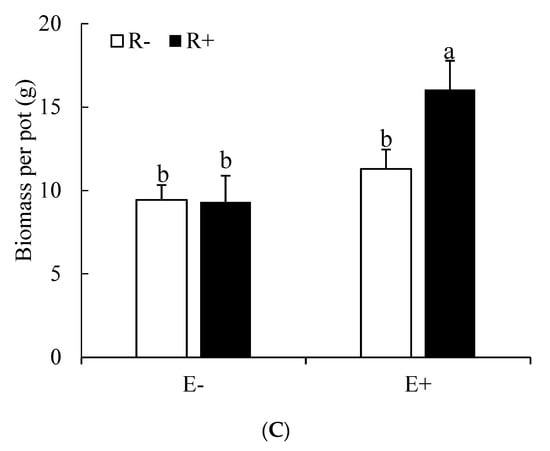 (A–C) The influence of endophytic fungi and rhizobia on the biomass of tall fescue. E−, endophyte-free tall fescue, E+, endophyte-infected tall fescue; AMF+, AMF-inoculated; AMF−, AMF-free; R+, rhizobia-inoculated; R−, rhizobia-free. Different small letters indicate significant differences between treatments (p < 0.05).