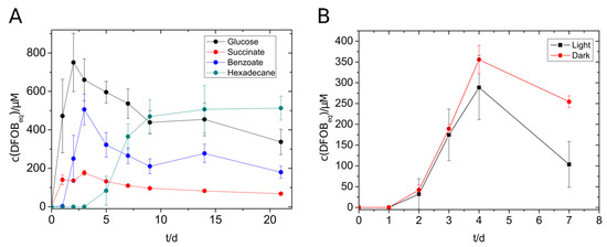 Siderophore production of V. paradoxus with different substrates (5 mM) (A) and with benzoate (5 mM) in the presence or absence of light. (B) Experiments were done in triplicates. The concentration of siderophores was measured using the standard CAS assay.