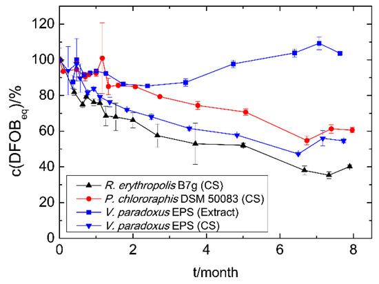 Time-dependent siderophore concentration of culture supernatants (CS) and siderophore extracts. Cell-free culture supernatants and the methanolic extract were stored at 4 °C. The concentration was measured using the CAS assay as DFOBeq. The initial siderophore concentration represents 100% and varied among the different strains and methods: Sid-ReB7g 780 µM, Sid-PcDSM 110 µM, Sid-VpEPS (CS) 490 µM, and Sid-VpEPS (extract) 1500 µM.