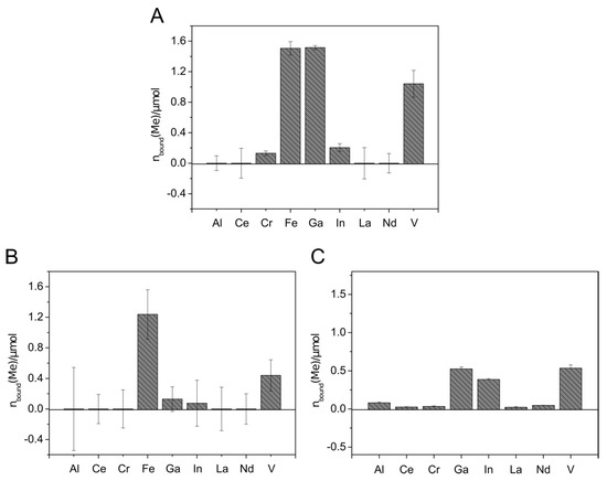Metal binding by Sid-ReB7g-loaded columns. Metal solutions were applied containing either one single metal ion (14 µmol) (A), mixed metal ions (each 14 µmol) (B), or mixed metal ions (each 2 µmol) (C). C18 columns without siderophore served as blank samples. The metal concentration in the flow-through was detected using ICP-MS. The total amount of metal bound to the immobilized siderophore columns is visualized. All experiments were done in duplicates.