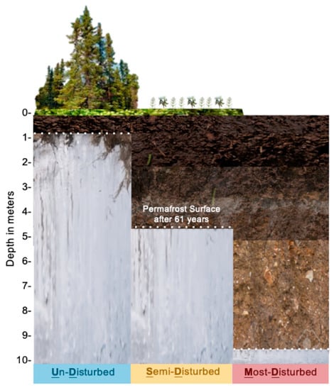 Diagram of the disturbance level sites (Undisturbed = UD, Semi-Disturbed = SD, Most-Disturbed = MD) at the Fairbanks Permafrost Experiment Station (FPES) and the subsequent depth of permafrost thaw after 61years.