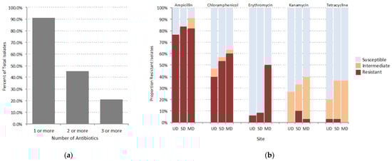 (a) Percent of total isolates with at least intermediate resistance to one or more, two or more, and three or more of the antibiotics tested. (b) Proportion of isolates at each FPES thaw site with the associated level of susceptibility (susceptible = light blue, intermediate = orange, resistant = red) to each antibiotic tested based on CLSI breakpoints.