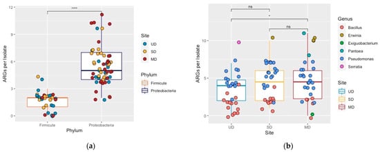 Although the abundance of ARGs increased with FPES disturbance levels (UD = 101, SD = 133, MD = 145), we found the number of CARD hits per isolate was highly significant by phylum (Kruskal-Wallis p = 2.8 × 10−13; Figure 3a) rather than FPES site (Kruskal-Wallis p = 0.083; Figure 3b). Although FPES site was not significant as a predictor, there was a significant difference between the numbers of ARGs per isolate from the undisturbed to most-disturbed sites (Wilcoxon p = 0.045). When comparing generalized linear models containing FPES site, phylum, and both site and phylum as predictors of ARGs per isolate we found that the model with phylum alone had the best fit (AIC = 349 phylum; 429 FPES site; 351 both).