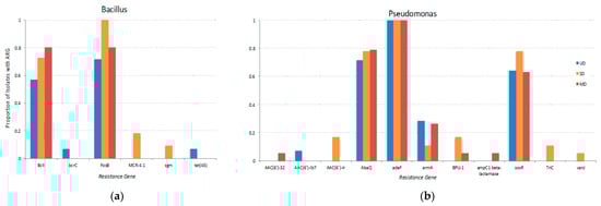The proportion of (a) Bacillus and (b) Pseudomonas isolates from each FPES site that contain each ARG.