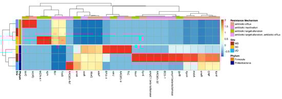 Heat map displaying the z-score by column of ARG count normalized by number of isolates in each group (phylum and FPES site). Annotation colors on the side show FPES site and phylum of each group and annotations on top show the resistance mechanism of the associated ARG. Dendograms display clustering based on Pearson correlation.