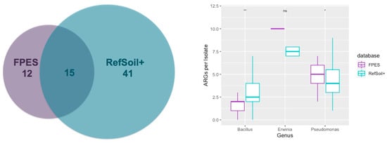 (a) Types of ARGs by database (b) Boxplot of the number of antibiotic resistance genes per isolate by genus and database (FPES vs RefSoil+). Wilcoxon test significance p < 0.01 **, p < 0.05 *, >0.1 ns.