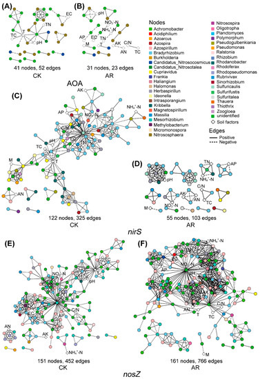 - Ma, B.; Wang, H.; Dsouza, M.; Lou, J.; He, Y.; Dai, Z.; Brookes, P.C.; Xu, J.; Gilbert, J.A. Geographic patterns of co-occurrence network topological features for soil microbiota at continental scale in eastern China. ISME J. 2016, 10, 1891–1901. [Google Scholar] [CrossRef]