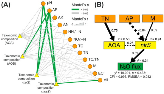 - Tang, Y.; Yu, G.; Zhang, X.; Wang, Q.; Tian, D.; Tian, J.; Niu, S.; Ge, J. Environmental variables better explain changes in potential nitrification and denitrification activities than microbial properties in fertilized forest soils. Sci. Total Environ. 2019, 647, 653–662. [Google Scholar] [CrossRef] [PubMed]