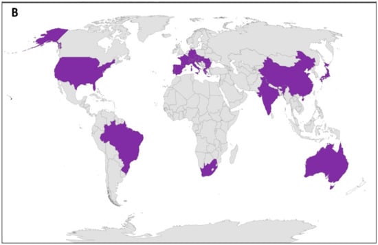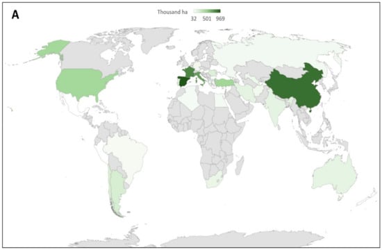 Global vine-growing areas allocated for the production of wine grapes, table grapes, or dried grapes in 2018 (sources Organisation of Vine and Wine and ood and Agriculture Organization of the United Nations) (A), compared to countries where P. viticola fungicide resistance was reported in 2020 (B) [34,35,36,37,38,39,40,41,42,43,44].
