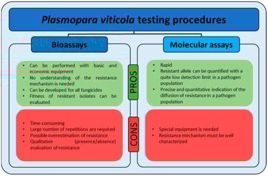 There is a great diversity among the testing procedures available for monitoring, and different information about the emergence and extension of resistance can be obtained using different methodologies. In the absence of molecular tools, biological tests remain fundamental in monitoring, and the degree of variation compared to a baseline sensitivity represents a good marker of changes in resistance. Considering the various resistance evolutionary phases and the complex life cycle of P. viticola, the information on the resistance phenomenon obtained with a single testing method is not sufficient. The mode of action of the fungicide under investigation, the characteristics of the targeted genetics, and the percentage of resistant strains in the investigated population can strongly influence the results, and the use of multiple testing procedures can help by providing a global and realistic view of resistance evolution.