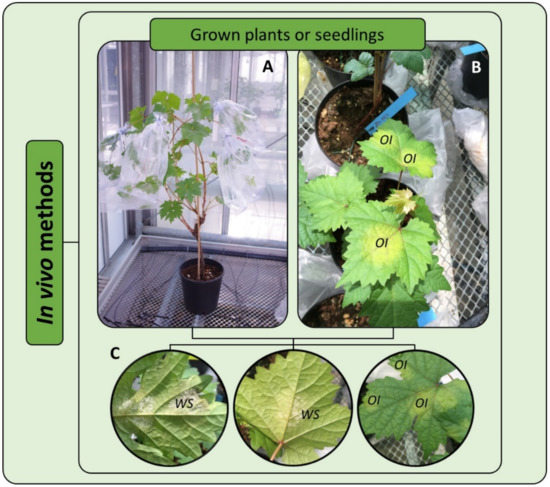 In the case of P. viticola, as for other obligate biotrophs, in vivo tests that are carried out on adult plants or seedlings are challenging. A first issue is related to plant material production during the whole monitoring period that might require a significant logistic effort. The cost and time associated with plant production might be the limiting factors for a high-throughput experiment and can impact the possibility of including replicates, as is normally done for in vitro testing. Whole plant assays are based on the evaluation of pathogenicity on intact plants. The tested fungicide is applied at increasing rates to the leaves (usually the third–fifth from the apex of the shoot) using a laboratory sprayer. The fungicide must be uniformly applied to both the upper and lower side of the leaf one day prior to the inoculation of the sporangia suspension (5 × 104 sporangia/mL) with a handheld sprayer. Formulated products should be preferred instead of the use of technical active ingredients, which might have issues relating to adherence to the plant surface. Inoculated plants are subsequently incubated in a climate chamber at 20 °C and saturating humidity (Figure 4A) for a period of six days, after which disease assessment is visually performed on three leaves per plant (four plants for treatment as biological or technical replicates) to compare the disease severity of the treated and untreated control samples (Figure 4B,C) [74]. In some cases, the same population tested using whole plant or detached leaf disc assays can generate different results [53]. It appears that changes in physiological and molecular states caused by leaf detachment can contribute to decreasing the host resistance response compared to that of intact plants [75,76]. Furthermore, it may be possible that whole plant assays are ineffective to detect a low proportion of resistant phenotypes [54].
