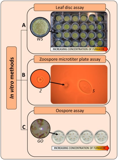 In vitro testing for P. viticola based on leaf disc bioassay (A), zoospore microtiter plates (B), and oospore testing (C). (A) microtiter plate containing leaf discs showing white sporulation (WS). Columns were treated with increasing concentrations of fungicide. (B) Sporangium (S) and free zoospore (Z) in liquid medium. (C) Agar plates containing increasing concentrations of fungicides and inoculated with oospore suspensions. The number of germinated oospores (GO) is counted and used to calculate the germination percentages at each concentration and to estimate the EC50 values of the population or the percentage of resistant oospores at a discriminatory concentration of fungicide.