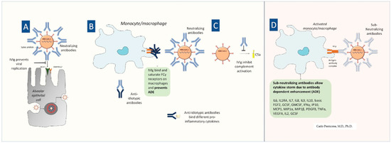 The hypothetical dual role of IVIG in SARS-CoV-2 infection. IVIG can be beneficial since (A) neutralizing antibodies binding spike protein may prevent SARS-CoV-2 attachment to the ACE2 receptor thus inhibiting viral entry into the cell and in turn viral replication; (B) IVIG can bind and saturate Fcγ receptors on innate immune cells (e.g., macrophages) in the lungs, thus preventing ADE. Anti-idiotypic antibodies can bind to anti-viral antibodies as well as to proinflammatory cytokines. (C) IVIG are well-known modulators of the complement cascade activated by SARS-CoV-2; (D) Fc receptor-mediated ADE may occur when antiviral neutralizing antibodies cannot completely neutralize the virus thus macrophages (and other innate immune cells) are stimulated towards the exaggerated inflammatory response leading to the cytokine storm. [A, B, C, and D in the figure refer to the same letters in the above-mentioned comments in the text.].