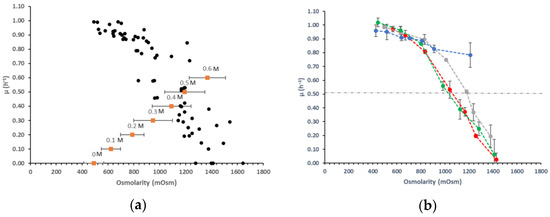 (a) Specific growth rate (● h−1) of L. lactis NCDO 2118 measured in chemically defined medium (CDM) containing various concentrations of salts or polyols (0 to 0.6 M) and corresponding range of osmolarity at a given salt or polyol molarity (■ and the given concentration above in M) after 6 h of growth (b) mean of specific growth rate (h−1) of L. lactis NCDO 2118 measured in CDM containing various concentrations of chloride ●, phosphate ●, or sulfate ● salts or polyols ●.