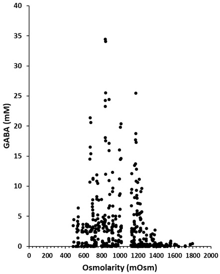 The data obtained in this work show that, at osmolarities ranging between 487 to 1795 mOsm, ionic (salts) and non-ionic (polyols) stresses had different effects on growth and GABA production. Hyperosmotic conditions generated by polyols were much less harmful for growth than those linked to salts at similar osmolarities. Quite similar observations have been made for Lactobacillus plantarum [45] under sugar stress. Polyols have been described as osmoprotective compounds [46,47,48]. Although polyols did not negatively affect the growth rate, the related increased osmolarity did not result in a sharp GABA increase. No clear correlation between GABA synthesis and osmolarity was observed in the present study, considering all the different osmoregulatory solutes tested. This indicated that the relationship between osmolarity and GABA production was more complex than previously hypothesized and this was at least partially explained by variable influence of osmolarity solutes on growth performances, which also directly impact GABA production.