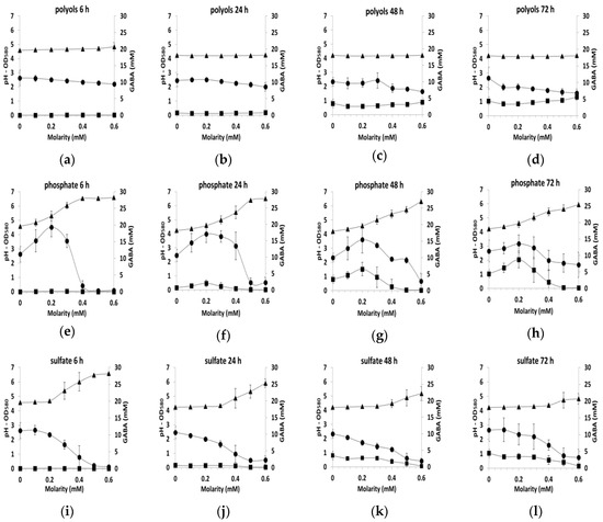 With polyols, the level of biomass was relatively constant irrespective of the polyol concentration in the medium or the sampling time and the pH remained also constant in the range 4.1–4.2. (Figure 3a–d). GABA production was observed only at 48 and 72 h and reached 2.5 to 5 mM. With ions, more variable profiles were observed as function of the sampling time (Figure 3e–p). Growth was generally inhibited by salts for concentrations higher than 0.2–0.3 mM, as indicated by the decrease in biomass production associated with the increase in pH above 4.1–4.2. For the phosphate ion only, an increase in growth was detected before the growth inhibition (between 0 to 0.2–0.3 M from OD 2.7 to 3.6). This was probably related to the buffering capacity of phosphate ions.