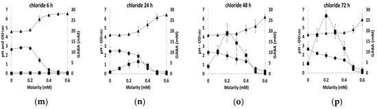 In all the tested conditions, GABA production occurred only in the acidic environment, namely when pH was between 4.3–5.0. In the presence of sulfate, the maximum GABA production was about 2.5 to 3.2 mM, while with phosphate salts, this production reached 4.4 to 8.7 mM. This difference in the production was at least partially explained by the higher biomass production in the presence of phosphate salts. While the pH and biomass production profiles with chlorides were very similar to those with sulfate, GABA production diverged greatly. With chlorides, GABA production reached 6 mM at 24 h and exceeded 30 mM at 72 h. This early and efficient production was the maximum observed here, indicating that GABA production is activated by chlorides.