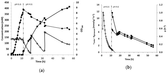 Previous experiments were performed in tubes with a synthetic medium (CDM) that is exclusively used in the laboratory. Hence, the potential of L. lactis NCDO 2118 to produce GABA in more realistic conditions was tested with a rich medium favoring growth (M17 medium supplemented with yeast extract (10 g/L) and glucose (45 g/L)) and in controlled conditions in a bioreactor with an initial osmolarity of 983 mOsm. NaCl (0.3 M) was also added into the medium since the tests in tubes described above demonstrated that it is the most important factor promoting GABA production. The initial L-glutamic acid concentration was 137 mM, then, two additions of about 151 mM each were made when the concentration dropped to less than 10–20 mM. pH was maintained at 6.6 until 11 h to obtain high biomass production before changing to an acidic pH of 4.6–4.7 which corresponded to the optimal pH for the GAD enzyme [37]. This complex medium associated with maintaining pH at 6.6 made it possible to achieve a biomass of 2.52 g/L (OD580 = 8.4) (Figure 4a). The biomass was thus increased almost by a factor of three compared to the conditions in tubes (about OD580 = 3 without salts or polyols). As soon as the pH was regulated to 4.6, GABA production started, while the growth instantly stopped. Then the biomass level slowly decreased all along the GABA production phase, suggesting the arrest of cell multiplication. Within 7 h the cells converted 90% of the supplied glutamate into GABA (Figure 4a). The first glutamate addition (about 136 mM) was consumed at 78% in 13 h. After the second glutamate addition, a final GABA concentration as high as 413 mM was reached after 56 h of culture. The profiles of the specific rates of glutamate consumption and GABA production are shown in Figure 4b. They followed the same evolution and decreased slowly while the specific growth rate was zero after 11 h of growth (Figure 4b).