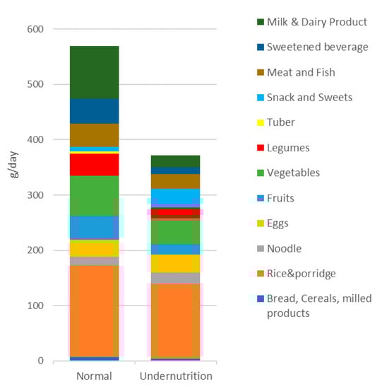 Table 2 shows the daily dietary intake between the two groups, which evaluates ten days of food records. An expressive difference between the two groups in daily dietary intake was observed in all analyzed parameters. The normal group’s energy intake reached 69.18% of Indonesia’s RDA; meanwhile, the undernutrition group only 50.69%. According to Hayati et al. [25], energy intake is sufficient to meet 70% of the RDA. Although the normal group’s energy intake was less than 70%, it was higher than the undernutrition group. Moreover, in both groups, carbohydrates and dietary fiber intake were less than 70% of RDA. Figure 1 shows the subject’s amount of food per day summarized from the shopping list from the Nutrisurvey program. The normal group consumed 569.69 g food/day, higher than the undernutrition group, which only 372.15 g food/day. Interestingly, the undernutrition group tended to consume more snacks and sweets (33.8 g/day). In addition, undernutrition groups consumed fewer vegetables and fruits than normal groups, which is why dietary fiber intake in the undernutrition group was low.