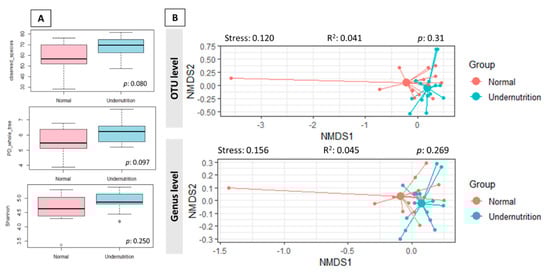 (A). Alpha diversity of gut microbiota between normal and undernutrition group. The difference between the group was analyzed using the Wilcoxon rank-sum test (B). The Bray–Curtis dissimilarity-based NMDS between normal and undernutrition group. Each data point in the graph stands for a sample. The distance between data points reflects the similarities between samples. The stress factor < 0.2 indicates the reliability of the result.