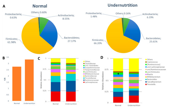 Figure 3A shows the difference of gut microbiota on the dominant phylum level between normal and undernutrition groups. The mean relative abundance of Actinobacteria and Bacteroidetes in the normal group was 8.55 ± 10.36% and 27.17 ± 9.31%, respectively. Whereas in the undernutrition group, both phyla were lower, which was 6.19 ± 4.28% and 25.61 ± 10.98%, respectively. On the other hand, Proteobacteria was more abundant in the undernutrition group (1.48 ± 2.34%) than normal (0.63 ± 0.77%). As the most dominant phylum in the human gut, the proportion of Firmicutes in normal and undernutrition groups was 61.98 ± 15.43% and 66.20 ± 12.82%. The relative abundance of Proteobacteria in the undernutrition group was 2.34 times higher than their normal counterparts. Moreover, Actinobacteria was 1.38 times higher in the normal than undernutrition group. Even though no significant difference was seen (p: 0.461), a higher F/B ratio in the undernutrition group (3.32 ± 2.03) over the normal group (2.75 ± 1.65) was observed (Figure 3B).