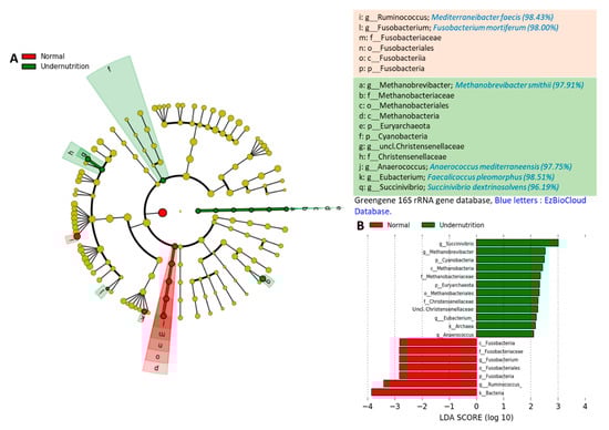 LEfSe showing the difference in gut microbial taxa between the normal and undernutrition group. (A) The cladogram shows the difference in gut microbiota between-group; the alphabet indicates the significantly different microbes in each group. Red color refers to the bacteria overexpressed in the normal group, and green color refers to the bacteria overexpressed in the undernutrition group. (B) Histogram of LDA score of gut microbiota between-group. Bar length represents the effect size, which explains the differentiating phenotypes between groups. k__, domain; p__, phylum; c__, class; o__, order; f__, family; g__, genus.
