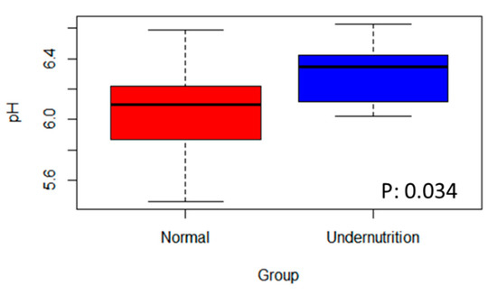 The SCFA profile was analyzed to evaluate the gut environment between normal and undernutrition groups. Here, the total organic acid was a sum of acetic, propionic, iso-butyric, butyric, iso-valeric, valeric, and iso-caproic acid. Acetic, propionic, and butyric acid was the high concentration SCFA detected from stool samples. The most abundant was acetic acid. A notable difference was observed between-groups (Table 3), propionic and butyric acid, with a high concentration in the normal group. Other than that, stool pH was analyzed to reflect the gut environment acidity due to microbial metabolites. Figure 5 shows the significant difference in stool pH between the group. The normal group had lower stool pH, which was 6.08 ± 0.32, while the undernutrition group was 6.30 ± 0.21.