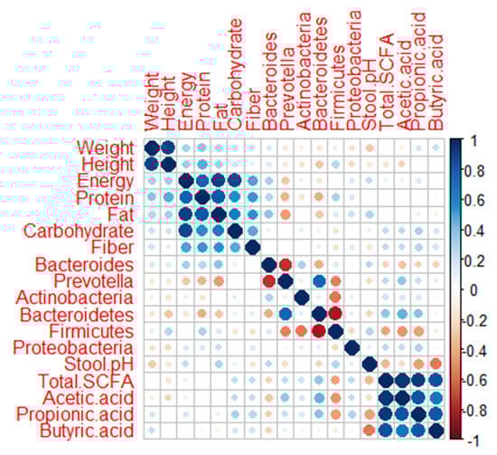 The dominance of Prevotelaceae, especially the genus Prevotella, indicated that both groups had Prevetolla enterotypes. These findings are in accordance with Nakayama et al. [19], where children who live in Southeast Asia tend to have the Prevotella type, which has a high carbohydrate and fiber diet. Based on the Spearman correlation analysis (Figure 6), Prevotella had a negative correlation with the intake of fat (p: 0.017; rho: −0.449) and protein (p: 0.059; rho: −0.362). On the other hand, Bacteroides were positively correlated with fat intake (p: 0.051: rho: 0.372) (Figure 6). This result is supported by Khine et al. [35], which explained the change in Bacteroides and Bifidobacterium’s dominance to Prevotella in Indonesian children after weaning. In addition, Prevotella type can be found in the younger and elderly groups in Indonesia [36]. In normal groups, they tend to maintain the dominance of Bacteroides and Bifidobacterium. Bifidobacterium is able to protect the gastrointestinal environment and is relatively common in individuals who have normal body weight [37,38,39]. In addition to having a glycan-degrading enzyme and a role in SCFA production, Bacteroides also has the ability to degrade animal-derived glycoproteins. This explains why the digestive tract in a diet high in fat and animal protein is dominated by Bacteroides [40]. Bacteroides, together with the genus Clostridium, are able to convert primary bile acid to secondary bile acid [41]. Secondary bile acid can activate TGR5 receptors that play a role in body weight, glucose metabolism, immune system modulation, and liver function [42].