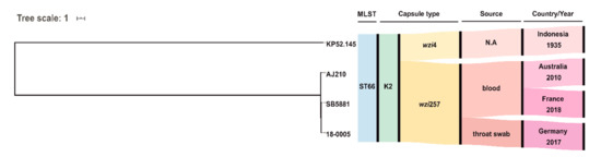 MLST analysis of the SPAdes assembled genome of 18-0005 identified sequence type ST66 that belongs to the clonal group CG66 [6]. Capsule typing revealed the serotype K2. Rodrigues et al. recently described the first ST66-K2 isolate identified in Europe; this isolate was obtained from blood and urine samples of a patient infected with HIV in 2018 in France [11]. Phylogenetic analysis revealed a relationship to the three known ST66-K2 isolates: (I) SB5881 isolated in 2018 from France [11], (II) AJ210 isolated in 2010 from Australia [18], and (III) “ancestral” reference Kp52.145 detected in 1935 in Indonesia (Figure 2) [11,19]. However, 18-0005 was more closely related to SB5881 (84 SNPs) than to AJ210 (152 SNPs) or Kp52.145 (409 SNPs).