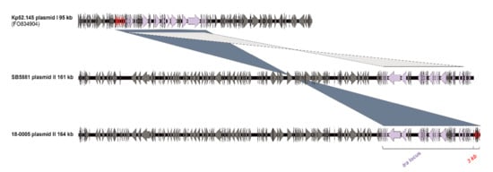 Kleborate analysis identified the virulence determinants aerobactin (iuc_2), salmochelin (iro_2) and the regulator of mucoid phenotype (rmpA_9/rmpA2_9). While Kp52.145 and AJ210 harbored only plasmid I (95 kb) and plasmid II (121 kb) a third small plasmid (3.7 kb) was detected in SB5881 and 18-0005. Furthermore, the latter two strains each carried a larger plasmid II. Comparison of the plasmid sequences in all isolates revealed the same integrated fragment on plasmid I, encoding a conjugation machinery; a copy of this fragment was detected on plasmid II in isolates SB5881 and 18-0005 (Figure 3). However, different from SB5881 plasmid II (161 kb), isolate 18-0005 harbored an additional 3 kb fragment of plasmid I in plasmid II (164 kb). This fragment contained putative transcription regulators and several uncharacterized proteins. These findings suggest a genetic flexibility of the virulence plasmid to integrate further virulence or antibiotic resistance determinants, in addition to its possibility of a conjugative transfer.