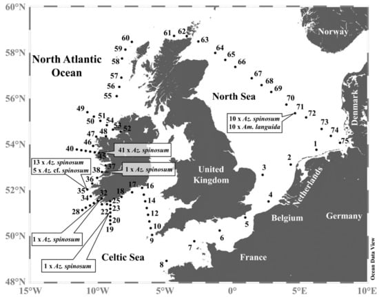 Strains were obtained from the Irish coast and from the central North Sea (Figure 1), with multiple strains of Az. spinosum obtained from stations 35, 45, and 71. All five Az. cf. spinosum strains originated from station 35, and new strains of Am. languida exclusively originated from the central North Sea station 71 (Figure 1). All strains were analyzed for their AZA profiles, most were investigated morphologically using LM or SEM, and sequence data were obtained for a selected number of strains (a detailed compilation of information on each strain can be found in Supplementary Materials Tables S4 and S5).