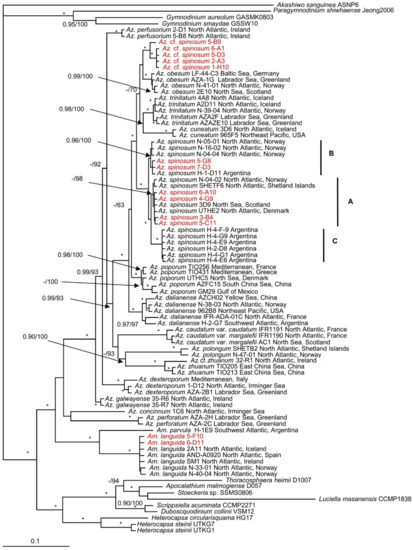 Molecular phylogeny of Azadinium and Amphidoma inferred from concatenated small subunit (SSU), internal transcribed region (ITS)-5.8S, and partial large subunit (LSU) rRNA gene sequences using Bayesian inference (BI). New sequences of Azadinium spinosum, Az. cf. spinosum, and Amphidoma languida are indicated in red. Ribotypes of Az. spinosum are marked with A, B, and C. Scale bar indicates the number of nucleotide substitutions per site. Numbers on branches are statistical support values (left, Bayesian posterior probabilities; right, maximum likelihood (ML) bootstrap support values). Bootstrap values >50% and posterior probabilities (pp) above 0.9 are shown. Asterisks (*) indicate maximal support (pp = 1.00 in BI and bootstrap support = 100% in ML, respectively).