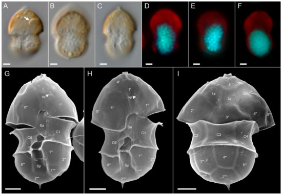 Azadinium spinosum ribotype B strain 5-F6. (A–F) LM images of living (A–C) cells to indicate general size and shape. Note the distinct pyrenoid in the episome (arrow in A). (D–F) Formalin fixed and DAPI-stained cells viewed with UV excitation to indicate shape and position of the nucleus. (G–I) SEM images of different thecae in ventral (G,H) or dorsal (I) view. Note position of ventral pore (vp). Plate labels according to the Kofoidian system. vp = ventral pore. Abbreviation of sulcal plates: Sa = anterior sulcal plate; Sp = posterior sulcal plate. Scale bars = 2 μm.