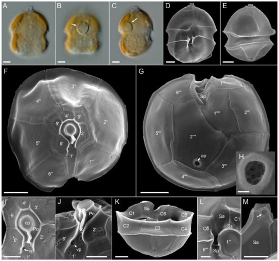 Amphidoma languida strains. (A–C) LM images of living cells to indicate general size and shape. Note the distinct pyrenoid in the episome (arrows in B,C). (D–M) SEM images of different thecae. (D) Ventral view. (E) Dorsal view. (F) Apical view of epithecal plates. (G) Antapical view of hypothecal plates. Note the antapical pore (ap). (H) Enlarged view of the antapical pore. (I) Detailed view of the apical pore complex (APC). (J) APC in ventral view, note the position of the ventral pore (vp). (K) Hypotheca in dorsal view. (L) Detailed view of sulcal plates. (M) Detailed view of the anterior sulcal plate. Note the anterior round ventral depression (arrow). Plate labels according to the Kofoidian system. ap = antapical pore; cp = cover plate; Po = pore plate; vp = ventral pore; X = X-plate or canal plate. Abbreviation of sulcal plates: Sa = anterior sulcal plate; Sd = right sulcal plate; Sm = median sulcal plate; Sp = posterior sulcal plate; Ss = left sulcal plate. Scale bars = 2 μm (A–G,K) or 1 μm (I,J,L,M) or 0.2 μm (H).
