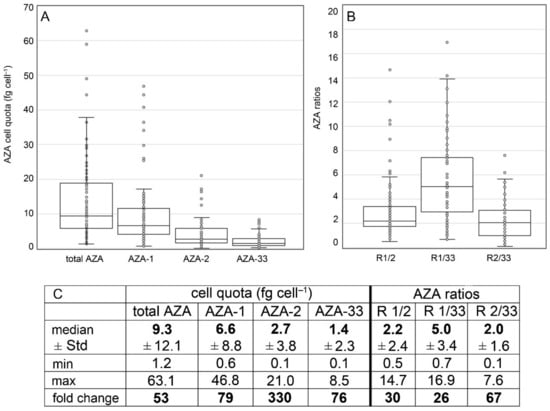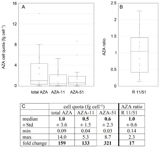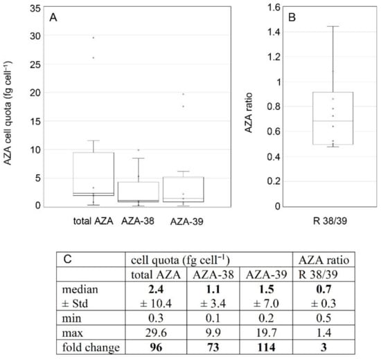 Azadinum spinosum ribotype A strains. Box-Whisker plots (A,B) and summary statistics (C) of all analyses (including repeated analyses of single strains) of AZA cell quota (A) and AZA ratios (B). Std = standard deviation.