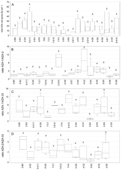 Azadinium spinosum ribotype A strains. Variability in total AZA cell quota (A) and AZA ratios (B–D) based on multiple analysis of single strains. Number above bars indicate the number of analyses (n).