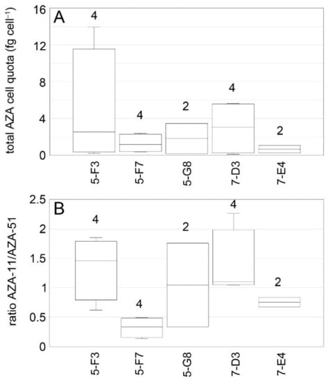 Toxin profile of Az. spinosum ribotype B strains consisted of AZA-11 and AZA-51 and was constant over time (Table 4). Total AZA cell quotas for ribotype-B strains ranged from <0.1 to 14.0 fg cell−1 (Figure 11). While median cell quotas of all analyses were similar for AZA-11 and AZA-51, the AZA-11/AZA-51 ratio (with a median value of 1.0) of individual analysis ranged from 0.1 to 2.3 (Figure 11). Total AZA cell quota estimates of single strains were variable as well, with fold changes of multiple estimates ranging up to 68-fold (Figure 12, summary statistics are listed in the Supplementary Materials Tables S11 and S12). The ratio of AZA-11/AZA-51 within single strains also varied around 1.0 but was consistently <1.0 or >1.0 for two or one strain, respectively (Figure 12). For none of the AZA parameters (total AZA cell quota, AZA-11, AZA-51, ratio 11/51) there were statistical differences between strains (Kruskal–Wallis ANOVA, p > 0.07) (Table 5).