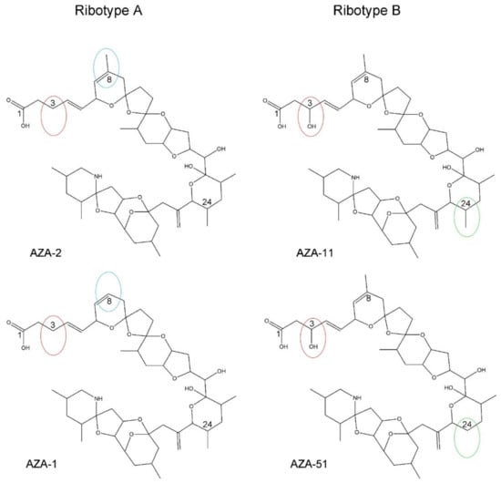 Structural variability of AZA profiles within a ribotype thus seems to be a common feature of toxic Amphidomataceae as it has also been seen in Az. poporum [,,] and Az. spinosum ribotype B strains []. In any case, the multiple strain approach clearly showed that within ribotype A strains there were consistent and stable (at least for one year) differences in presence/absence of AZA-1, AZA-2 and/or AZA-33. The implications of this, e.g., in terms of AZA synthesis pathways, are obscure at the moment but indicate that some AZA structural details may not be of vital importance for any physiological and/or ecological function. Ribotype A strains with deviating AZA profile all originate from Irish waters, and all three new Az. spinosum ribotype A strains from the North Sea had AZA-1, AZA-2- and AZA-33. However, among Irish strains, the presence of AZA-1, AZA-2, and AZA-33 was clearly the quantitatively dominant pattern (>50%; 32 of 60 strains), which may explain why this variability was not seen in previous Atlantic strains and not in the new North Sea strains either.