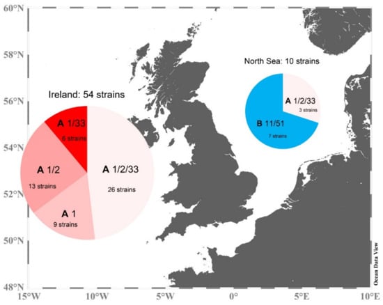 The multi-strain comparison of ribotype A and B strains show that in most cases, ribotype A strains contained a higher cell quota of AZA than ribotype B (median of all ribotype B strains: 1.0 fg cell−1; compared to 9.3 fg cell−1 for ribotype A strains), indicating that ribotype A is more toxic than ribotype B. The same was found for A and B strains from the Norwegian coasts (median total AZA cell quota for ribotype B strains: 1.1 fg cell−1; median total AZA cell quota for ribotype A strains: 4.5 fg cell−1) []. However, it has to be kept in mind that within ribotype A strains, a low AZA cell quota can also be found (Figure 9), so it might be better to say that up to now, no high cell quota (>15 fg cell−1) has been measured within B strains but are regularly registered within ribotype A strains. However, specific toxicity is not yet known for AZA-11 and AZA-51, and thus, a direct conversion of cell quota to toxicity for a better comparison with AZA-1 and AZA-2 is not possible at the moment. One important finding related to Az. spinosum ribotypes A and B is that even with a large number of Az. spinosum strains isolated from Ireland (57 strains), no single ribotype B strain was obtained, whereas B strains were the majority (seven of ten) of strains isolated from the North Sea (Figure 15). This relative dominance of B strains in the North Sea was not accompanied by the detection of AZA-11 or AZA-51 in the North Sea [], showing that Az. spinosum ribotype B strain density in the North Sea is not at a critical level. The dominance of B-type Az. spinosum in the North Sea, together with the lower qPCR quantification efficiency of B compared to A strains (Table S7), may have contributed to the comparable lower total amphidomatacean density estimate based on qPCR in the North Sea compared to microscopy counts []. In any case, the snapshot in time obtained with the present survey does not allow to rule out the presence of B-type strains around Ireland, but our data at least indicate that current monitoring using the A-strain specific qPCR assay does not appear to be heavily biased.