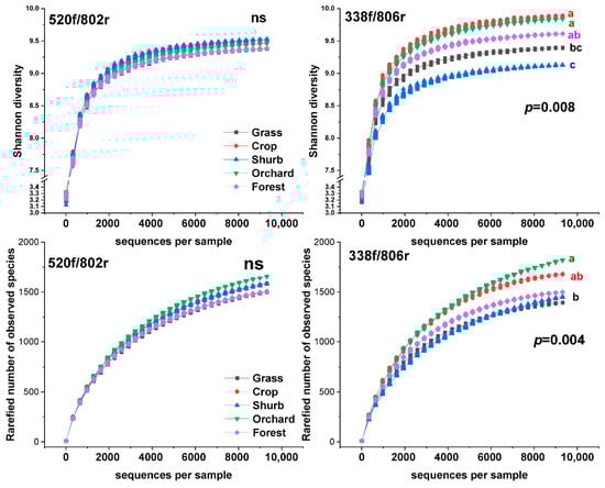 The Shannon diversity index and richness of soil bacteria in different land uses on the Loess Plateau. Primer pair 520f/802r targeted the V4 region of the 16S rRNA gene; primer pair 338f/806r targeted the V3–V4 region of the 16S rRNA gene. Ns, no significant difference.