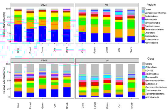 The community compositions of soil bacteria in different land uses on the Loess Plateau. The top panel represents the distributions of the soil bacterial community at the phylum level; the bottom panel represents the distributions of the soil bacterial community at the class level. Orh refers to orchards. Primer pair 520f/802r targeted the V4 region of the 16S rRNA gene; primer pair 338f/806r targeted the V3–V4 region of the 16S rRNA gene.