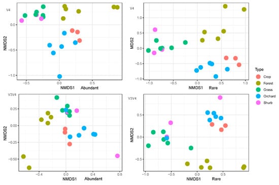 In arable land, the input of mineral fertilizer could stimulate the growth and reproduction of soil microbes, resulting in increases in soil microbial diversity, such as in croplands and orchards. High nutrient availability would promote the growth of soil copiotrophs []. Compared with arable soils, in the natural vegetation soils, we found lower soil bacterial diversity. This relatively low bacterial diversity in the grassland might be due to the lower input of nutrients than in other soils. Cropland and orchard soils had relatively more nutrients, such as TN and AVP contents, which may promote the growth of some taxa and enhance the diversity. Continuous crop cultivation increased soil bacterial diversity via soil nutrient supply []. In our study, soil AVP mainly affected rare bacterial diversity, whereas the abundant bacterial diversity has no significant associations with AVP. These results highlighted that soil nutrients would impact the diversity of soil bacteria, as previous studies reported that soil properties caused by land use type shaped soil bacterial community on the Loess Plateau [,]. Another potential factor is precipitation, which controls bacterial diversity, especially among rare bacteria. A global study showed that soil bacteria diversity was decreased as aridity increased []. We found that rare bacterial diversity (V4) significantly increased with elevated MAP. The abundant bacterial diversity generated by the two primer sets was stable with lower versions in changing climatic regimes. In arid–semiarid regions, precipitation might be the main limiting factor mediating soil microbial activity []. The increase in aridity decreased the content of soil organic C and total N but increased the content of inorganic P []. A previous study suggested that rare communities comprised more functional taxa in regulating the nutrient cycling [] and were more sensitive to changing climatic regimes. In this study, the positive associations between bacterial diversity and MAP highlighted the critical role of precipitation in altering soil rare bacterial diversity.