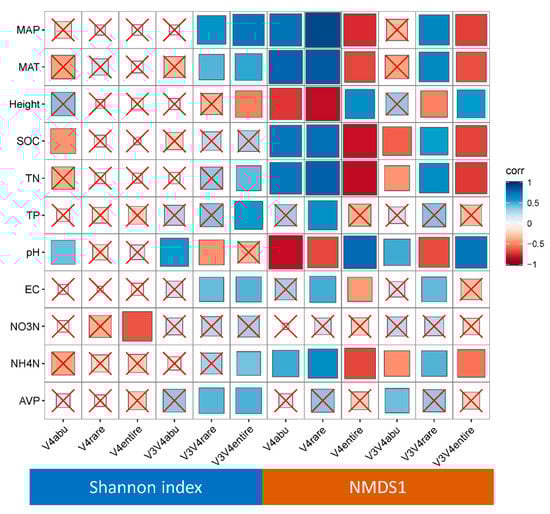 The associations between the diversity (Shannon index) and community structure (nonmetric multidimensional scaling 1 (NMDS1)) of abundant and rare soil bacteria in different land uses. Primer pair 520f/802r targeted the V4 region of the 16S rRNA gene; primer pair 338f/806r targeted the V3–V4 region of the 16S rRNA gene. The red crosses indicate nonsignificant correlations, and the size of the squares suggest higher Pearson coefficients. MAP, annual mean precipitation; MAT, annual mean temperature; SOC, soil organic carbon; EC, electrical conductivity; AVP, soil available phosphorus; TN, total nitrogen; TP, total phosphorous; NO3N, nitrate nitrogen; NH4N, ammonia nitrogen; abu, abundant bacterial taxa; rare, rare bacterial taxa; entire, the entire bacterial community.