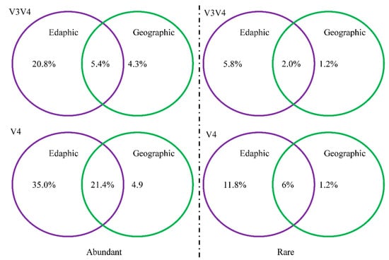 The variation in the community structure of abundant and rare soil bacteria explained by edaphic and geographic factors. Primer pair 520f/802r targeted the V4 region of the 16S rRNA gene; primer pair 338f/806r targeted the V3–V4 region of the 16S rRNA gene.