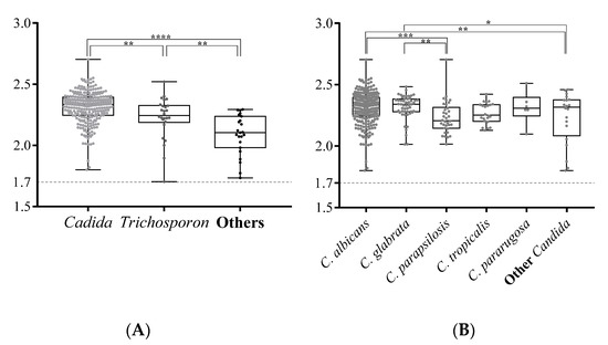 The log(score) values for yeast isolates that are identified using the MALDI-TOF Bruker Biotype. The Biotyper log(score) values for Candida, Trichosporon, and other genuses are compared in (A). All scores for the isolates of the Candida species that are identified by this study are compared (B). The box plots show the diversity of the log(score) values for the yeast isolates. The upper and lower edges of the boxes correspond to the first and third quartiles. The median is represented by a horizontal line within the box. The whiskers extend from the box in order from the highest to lowest. Each score is marked by a dot. The log(score) values are compared using an unpaired Student’s t-test; a p-value <0.05 is represented as *, <0.01 as **, <0.001 as ***, and <0.0001 as ****.