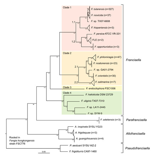 Whole genome maximum likelihood phylogeny of the complete Francisella near neighbor (FNN) dataset calculated with RAxML. Genus Francisella is divided into four separate clades indicated with different colors and numbered 1–4. The four most proximate genera to Francisella are also presented (the complete phylogenetic tree of Francisellaceae is presented in Figure A1).