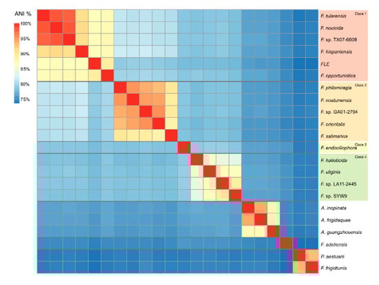 The genus Francisella consists of 11 different species according to the GTDB definition. The classification of F. novicida as a separate species or subspecies of F. tularensis has been debated [19,64,65]. The recognized species F. philomiragia and F. noatunensis have been considered synonymous in GTDB, and according to their classification, F. noatunensis should rather be considered as a subspecies of F. philomiragia. However, as illustrated in Figure 1, F. noatunensis represents a monophyletic sister clade population to F. philomiragia. F. orientalis and GA01-2794 are also regarded as a single species, which correlates with ANI values of 95%.