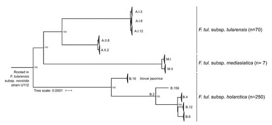 Francisella tularensis is divided into three subspecies: tularensis, mediasiatica, and holarctica (Figure 3); F. novicida is regarded as a separate Francisella species and not a subspecies of F. tularensis. F. tularensis subspecies tularensis (Type A) is further separated into two distinct genetic groups, A.I and A.II, with three major branches in A.I [67,68] and two major branches in A.II [69,70]. F. tularensis subspecies mediasiatica is divided into clades, M.I and M.II, wherein M.II is represented by three recently available genomes from Russia [71]. A third clade, M.III, has been proposed but no genomes are available for this clade [5]. F. tularensis subspecies holarctica (Type B) is divided into two major branches B.16 and B.2, wherein the latter is further divided into the four branches B.4, B.6, B.12, and B.159 according to canSNP nomenclature [72]. Most of the known isolates of F. tularensis subspecies holarctica belong to the three branches B.4, B.6, and B.12 [73,74,75,76]. Branch B.16 is usually named “biovar japonica” after where it was first discovered The clade with canSNP designation B.159 is represented by a single strain, F0835, to date only described from California, USA [69]. This strain, phylogenetically assigned to clade B.2 (Figure 3), falls between B.16 and the other three major clades in the F. tularensis subspecies tularensis (B.12, B.6 and B.4) phylogeny.