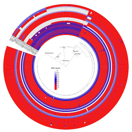 - Rasko, D.; Myers, G.S.A.; Ravel, J. Visualization of comparative genomic analyses by BLAST score ratio. BMC Bioinform. 2005, 6, 2. [Google Scholar] [CrossRef]