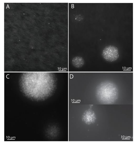 Cells of M. gorgona MG08 were pre-incubated on filters under an atmosphere of ambient air (~1.84 p.p.m.v. CH4, ~0.39 p.p.m.v. CO and ~0.7 p.p.m.v. H2) for eight months. The filters floated on diluted mineral medium within bottles to enable optimal gas transfer. After four months, a subset of the cells had developed into microcolonies of more than 100 cells (Figure 1), while some cells had not divided. Visual inspection and counting showed that the number of generations in the majority of the colonies had surpassed seven (64 cells) (Figure 1C), matching previous observations [4]. Studies have shown that up to three generations can be supported by intracellular storages [4,25,26], confirming that the eight-month pre-incubation was sufficient to ensure growth with carbon and energy harvested solely from air. After nine months of pre-incubation, the filter-containing glass bottles were sealed with rubber stoppers before defined headspace atmospheres were created (Figure 2).